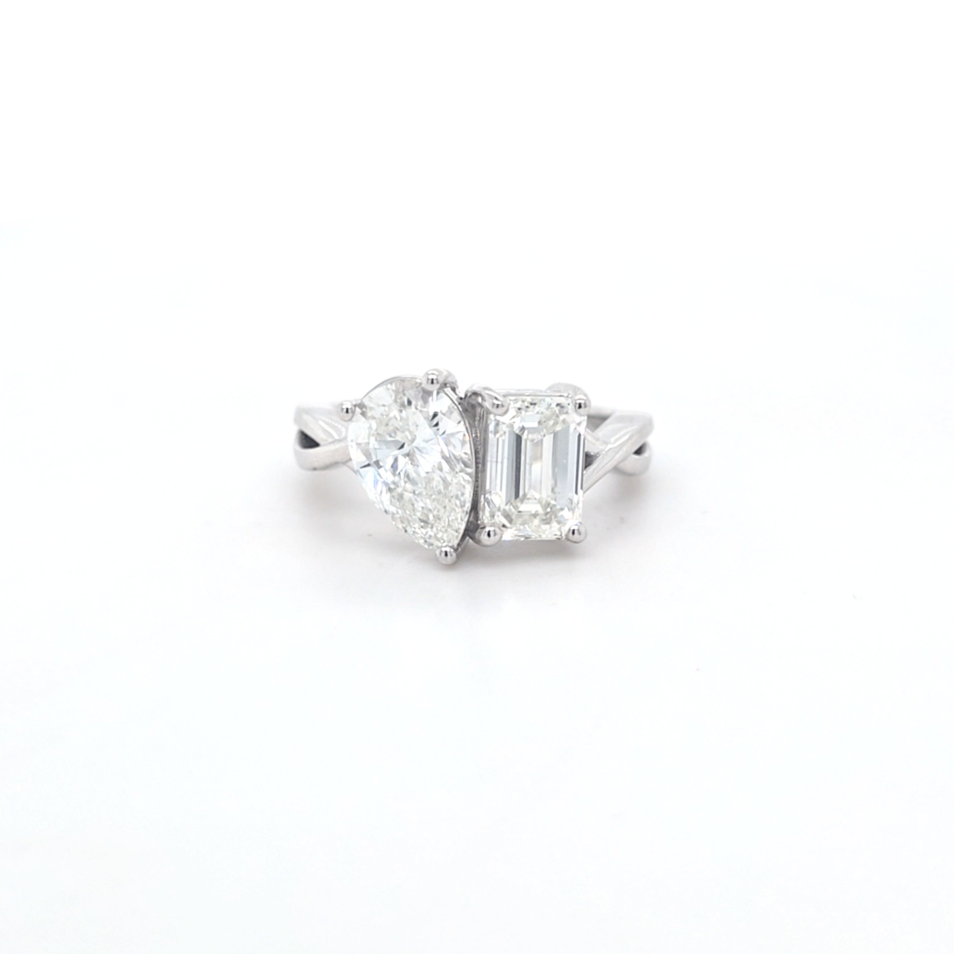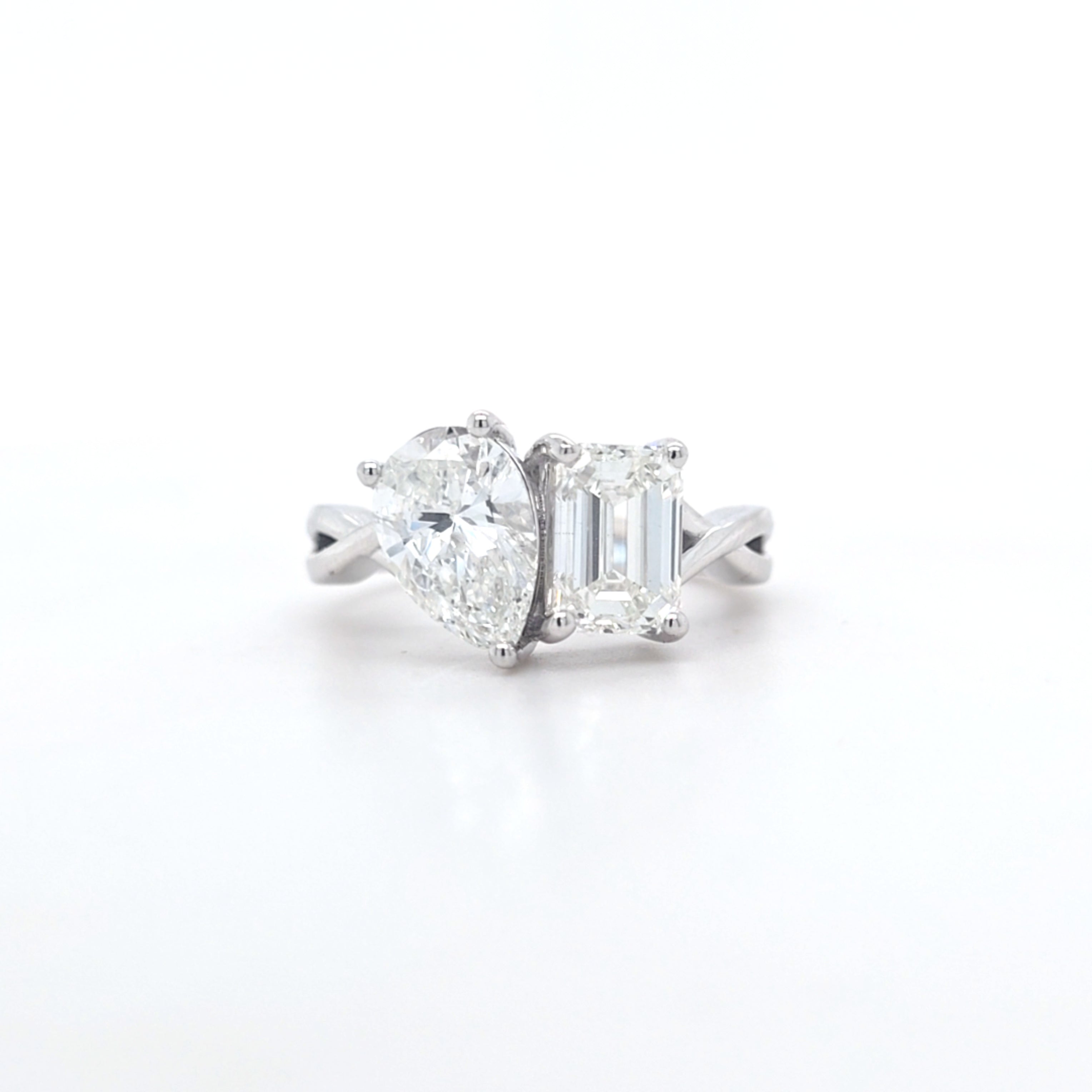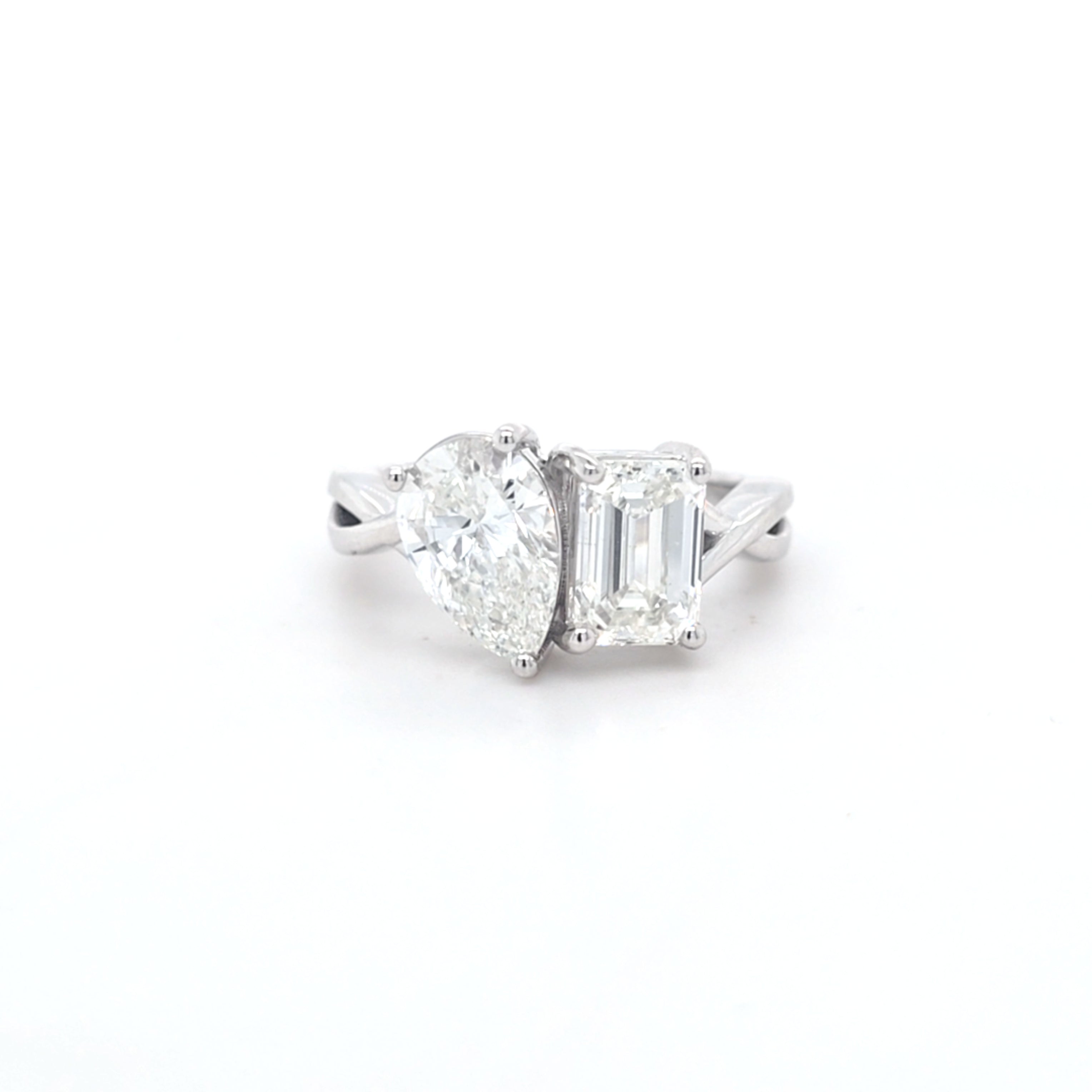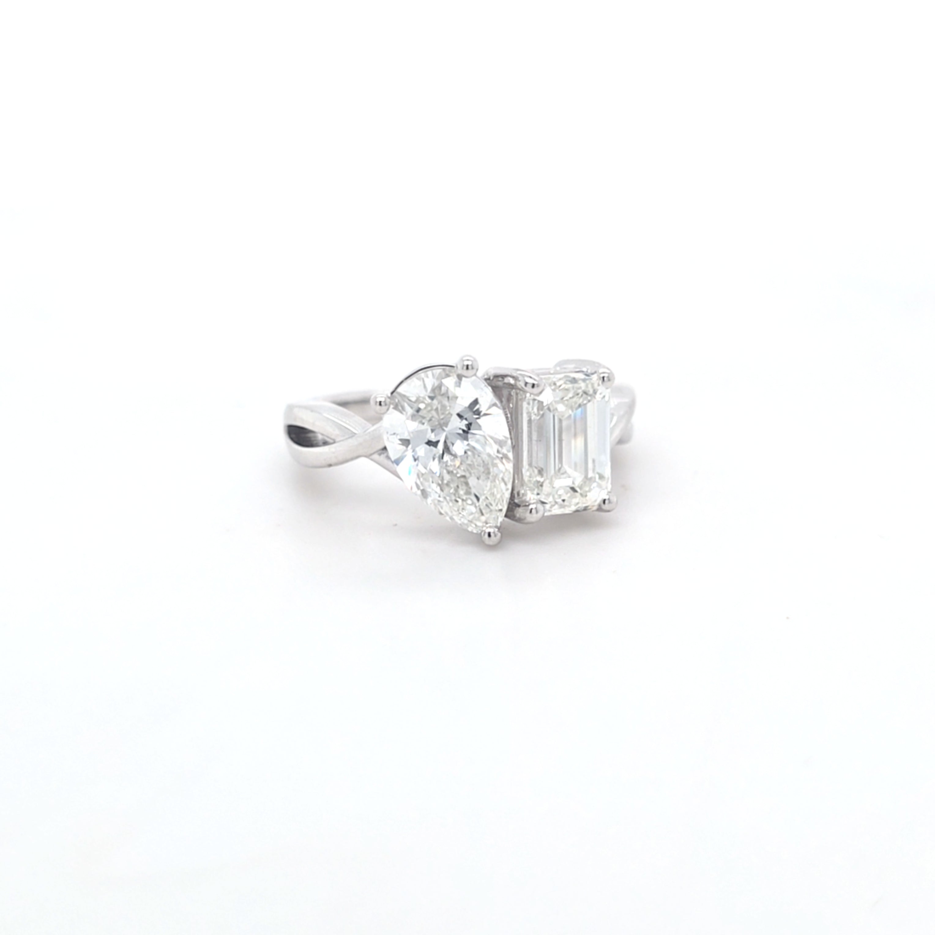 This Beautiful Emerald Cut & Pear Shape Laboratory Grown Diamond Toi et Moi Ring is Set in 9ct White Gold.