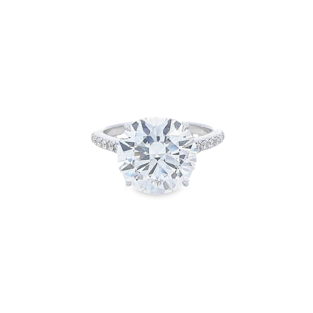 Beautiful Round Brilliant Cut Diamond Solitaire with a Hidden Diamond Halo and Diamond Shoulders set in 18ct White Gold, the Central 5.02ct Round Brilliant Cut Diamond is GIA Certified.
