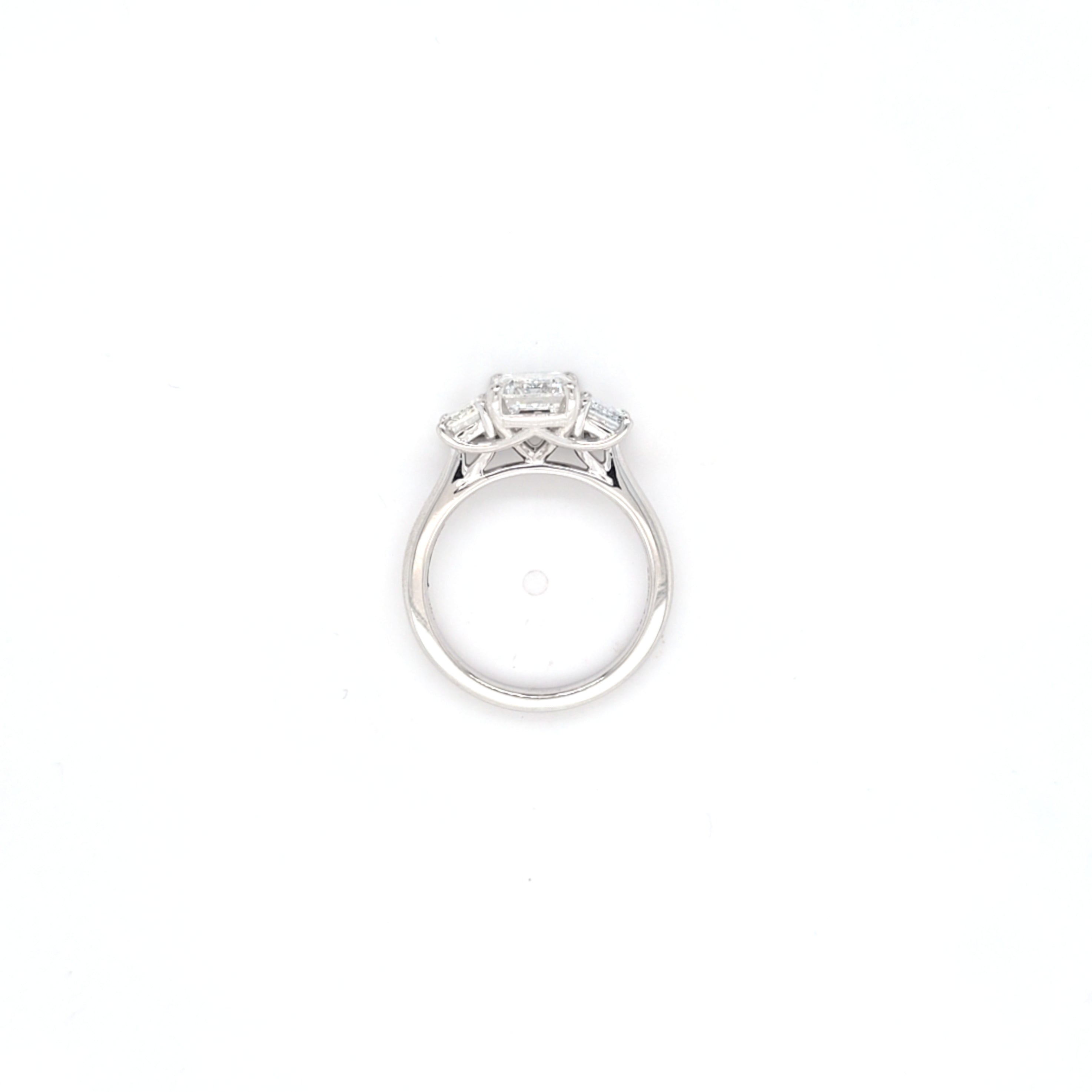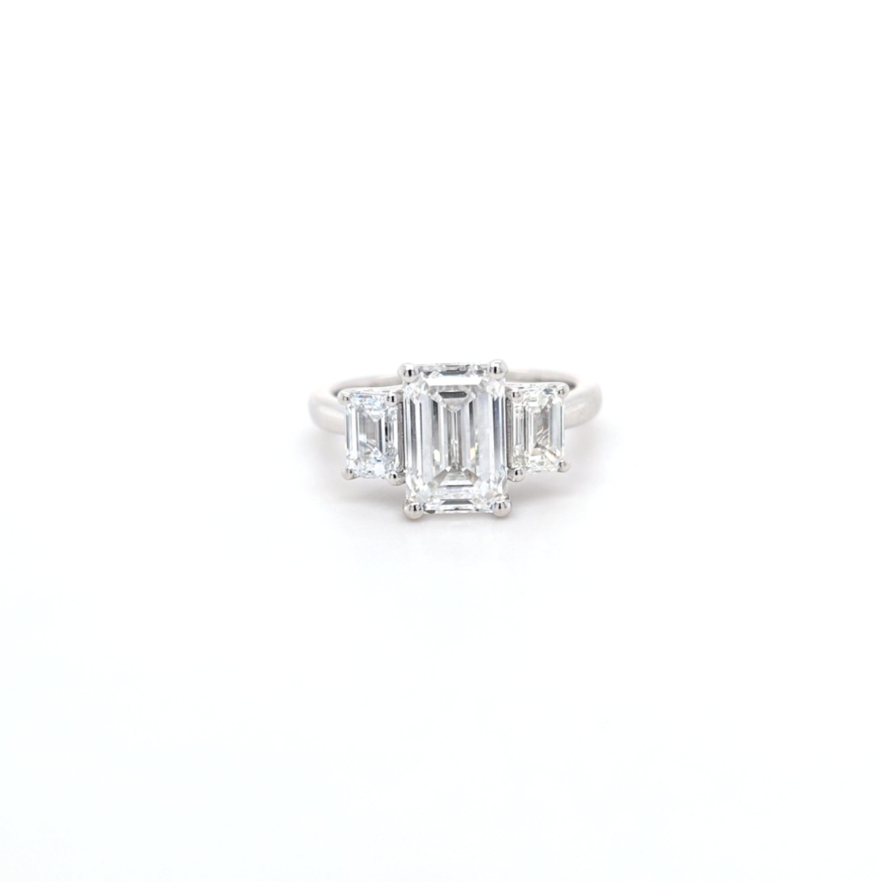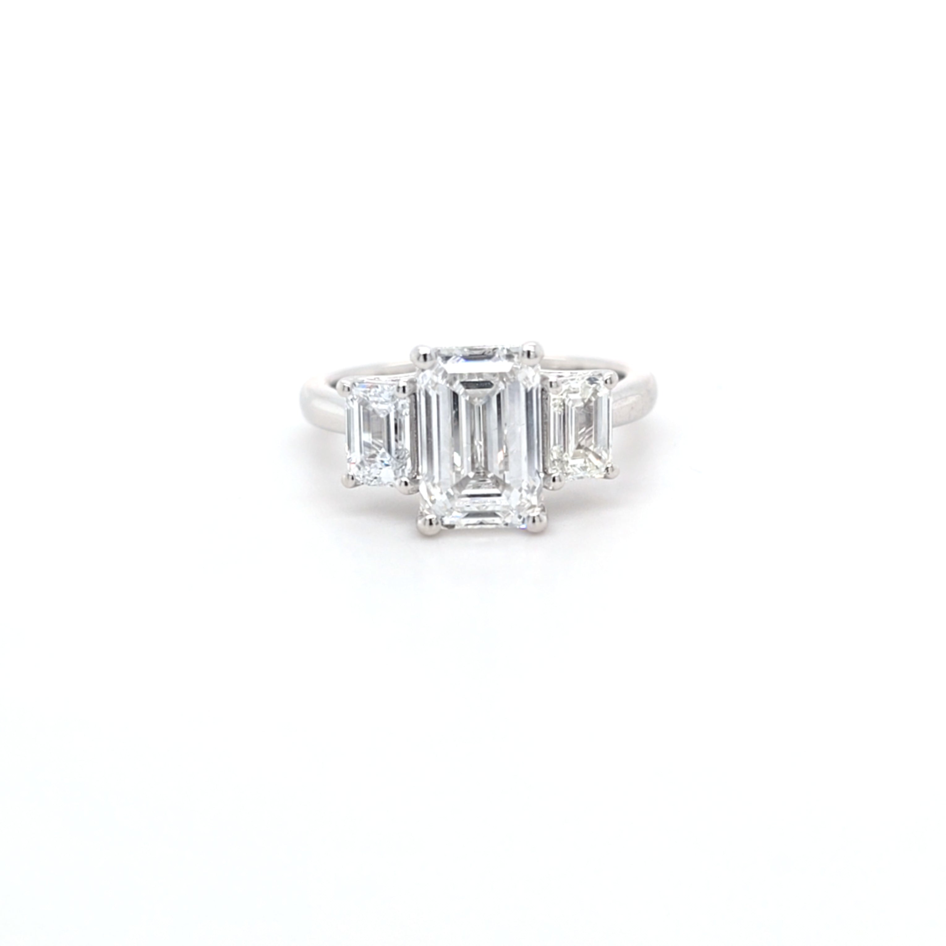 This Beautiful IGI Certified Emerald Cut Laboratory Grown Diamond Graded D Colour and VS1 Clarity is Set in Platinum (950) with LAB Diamond Emerald Cut Side Stones.