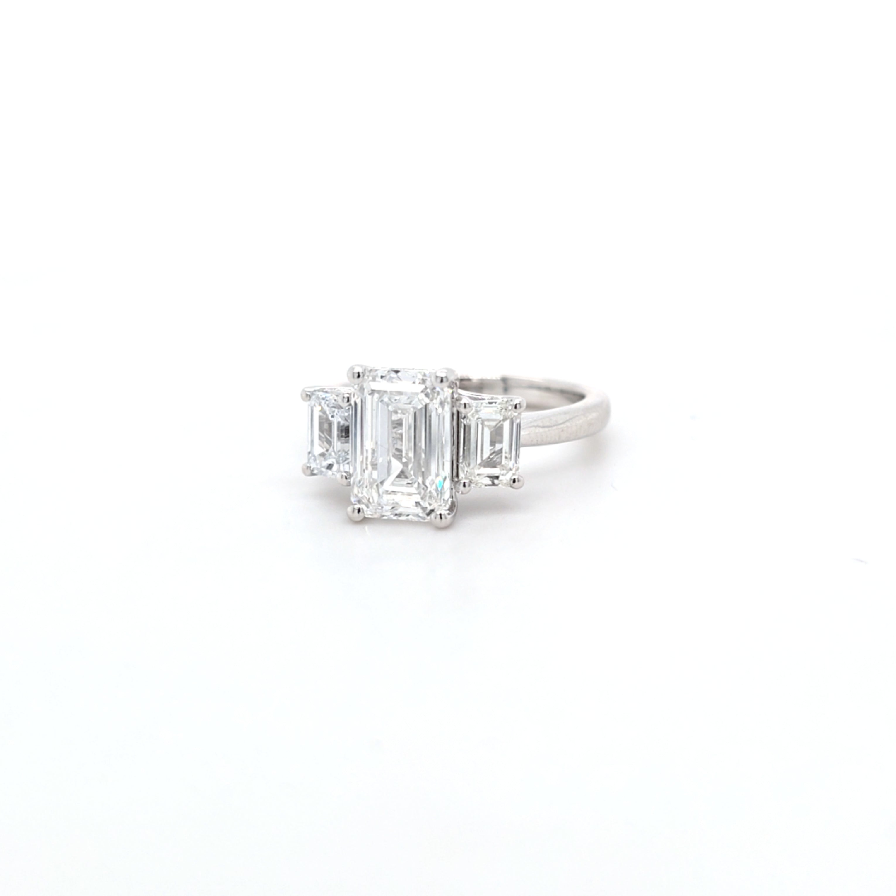 This exceptional three stone ring showcases a stunning 2.54ct Emerald Cut Lab Diamond at its centre, graded D colour and VS1 clarity by IGI. The principal stone is flanked by complementary accent diamonds, creating a sophisticated and timeless design. Crafted in platinum, this precious metal provides superior durability and a lustrous white finish that beautifully complements the diamond's brilliance. Lab diamonds offer the same optical and physical properties as mined diamonds whilst providing excellent value. The emerald cut's distinctive step facets highlight the stone's clarity and create an elegant, geometric aesthetic. An ideal choice for those seeking a refined solitaire with added sparkle and presence.